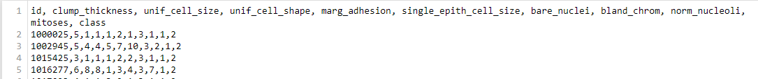 일단 데이터부터 구해보자. 데이터는 UCI 기계학습 데이터 저장소에서 구할 수 있는 위스콘신 대학에서 진행한 연구에서 집계한 유방암 진단 데이터를 가져오도록 하겠다.1 데이터 폴더(Data Folder) 링크에 들어가서 breast-cancer-wisconsin.data 파일을 다운로드하면 된다. 해당 파일을 열어보면 다음과 같이 CSV 형식의 데이터가 등장할 것이다.
