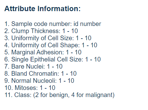 breast-cancer-wisconsin.names 파일을 더 뒤져보면 16개의 데이터 누락 사례가 있으며 해당 데이터는 "?"로 표기가 되었음을 확인할 수 있다. 출처 표기 요청에 따라 아래에 데이터 출처도 따로 표기하도록 하겠다.