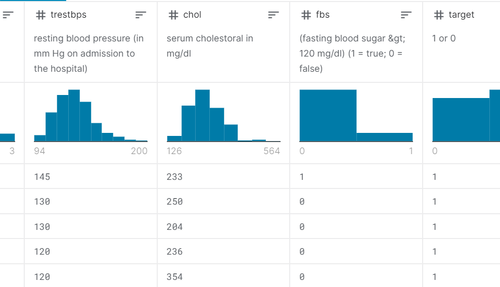 우리에게 다음과 같은 정보 집합(dataset)이 주어졌다고 해보자. 우리는 혈압, 혈중 콜레스테롤 수치, 혈당 같은 변수들과 기계학습 알고리즘을 이용해 환자가 심장질환이 있을 확률을 예측하고자 한다.
