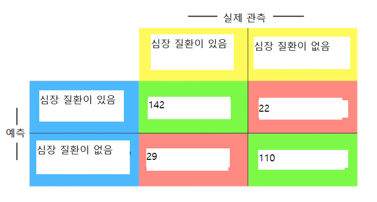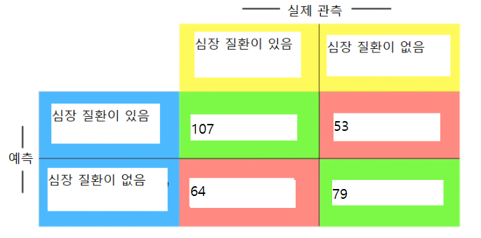 - 거짓 음성 (False Negative): 모델은 심장 질환이 없음을 예측했는데 실제 관측은 심장 질환이 있을 경우