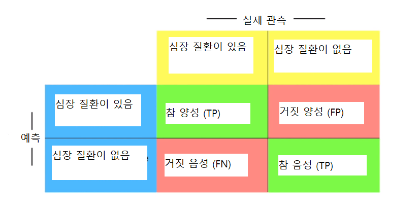 - 거짓 양성 (False Positive): 모델은 심장 질환이 있음을 예측했는데 실제 관측은 심장 질환이 없을 경우