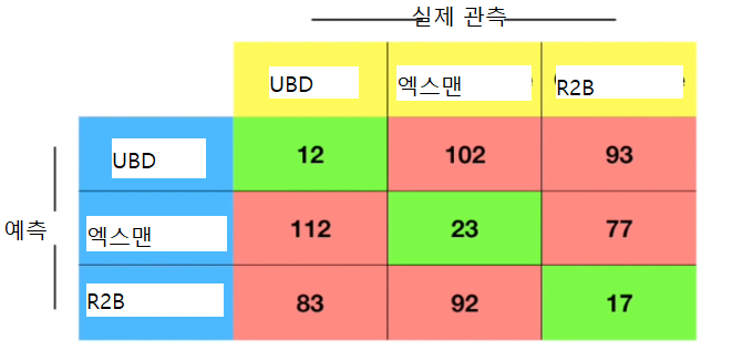 이때 예측하고자 하는 목표 변수가 UBD, 엑스맨, R2B 중 하나라면 우리의 혼동행렬은 다음과 비슷한 3행 3열일 것이다. 마찬가지로 대각선상에 올려져 있는 셀들이 우리가 원하는 올바른 예측이다. 추가로 예측하고자 하는 클래스가 40개라면 혼동행렬은 40 x 40 행렬일 것이다.