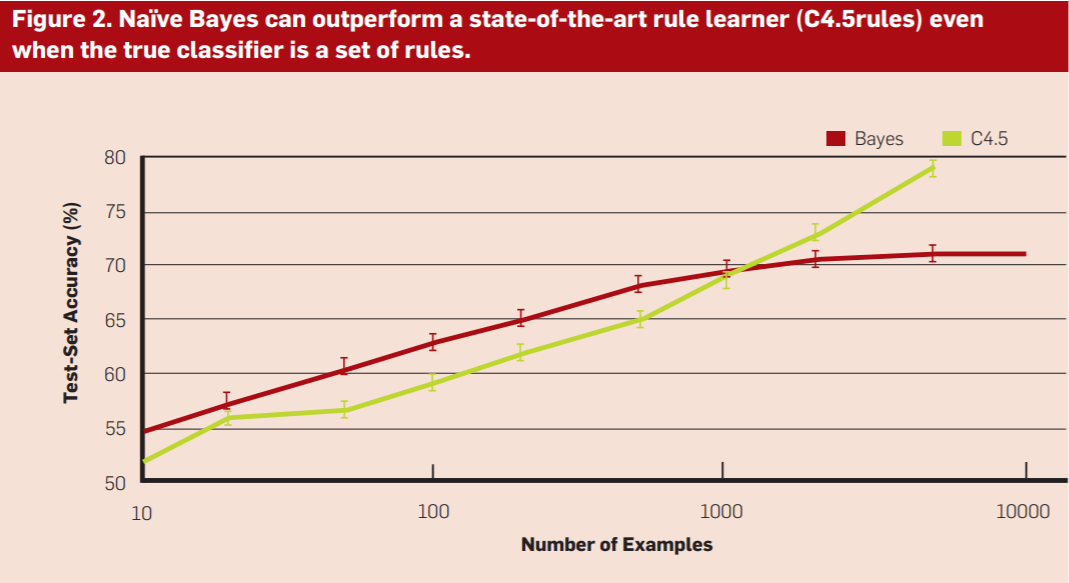 마찬가지로 최적화 방법론에도 비슷한 규칙이 적용됩니다. 빔(beam) 서치는 그리디(greedy) 서치보다 편향이 낮지만 다양한 가설들을 시범해보기 때문에 분산이 높습니다. 따라서 직관과는 달리 더 강력한 학습자라고 약한 학습자보다 무조건적으로 낫다는 것은 아니라는 것입니다. 이는 다음 그림에서도 볼 수 있습니다. 진짜 분류기가 그저 몇 가지 규칙임에도 불구하고 1,000개까지의 예시에서 나이브 베이즈 분류기가 더 정확도가 높습니다. 이는 데이터에 분류에 대한 나이브 베이즈의 잘못된 가정에도 불구하고도 일어납니다. 기계학습에서 이런 강한 거짓 가정을 가진 모델이 약한 참 가정을 가진 모델을 압도하는 상황은 후자가 과적합을 피하기 위해서 더 많은 데이터를 필요로 하기 때문에 자주 일어납니다.