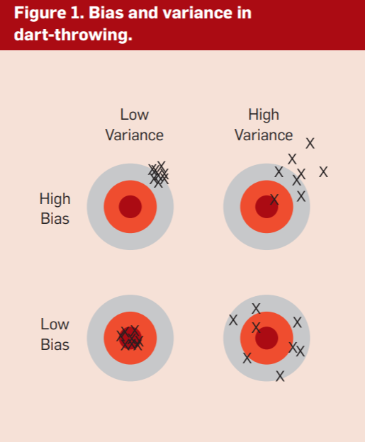 기계학습 분야에서 일하는 모두가 과적합에 대해서 알고 있지만 이는 분명하지 않은 여러 가지 형태로 등장합니다. 과적합에 대해서 이해할 수 있는 한 가지 방법은 일반화 오차(generalization error)를 편향과 분산으로 나눠보는 것입니다. 편향은 학습자가 일정하게 틀린 것을 학습하는 경향을 말합니다. 분산은 실제 신호(signal)와 전혀 상관없는 것들을 무작위로 배우는 경향을 말합니다.