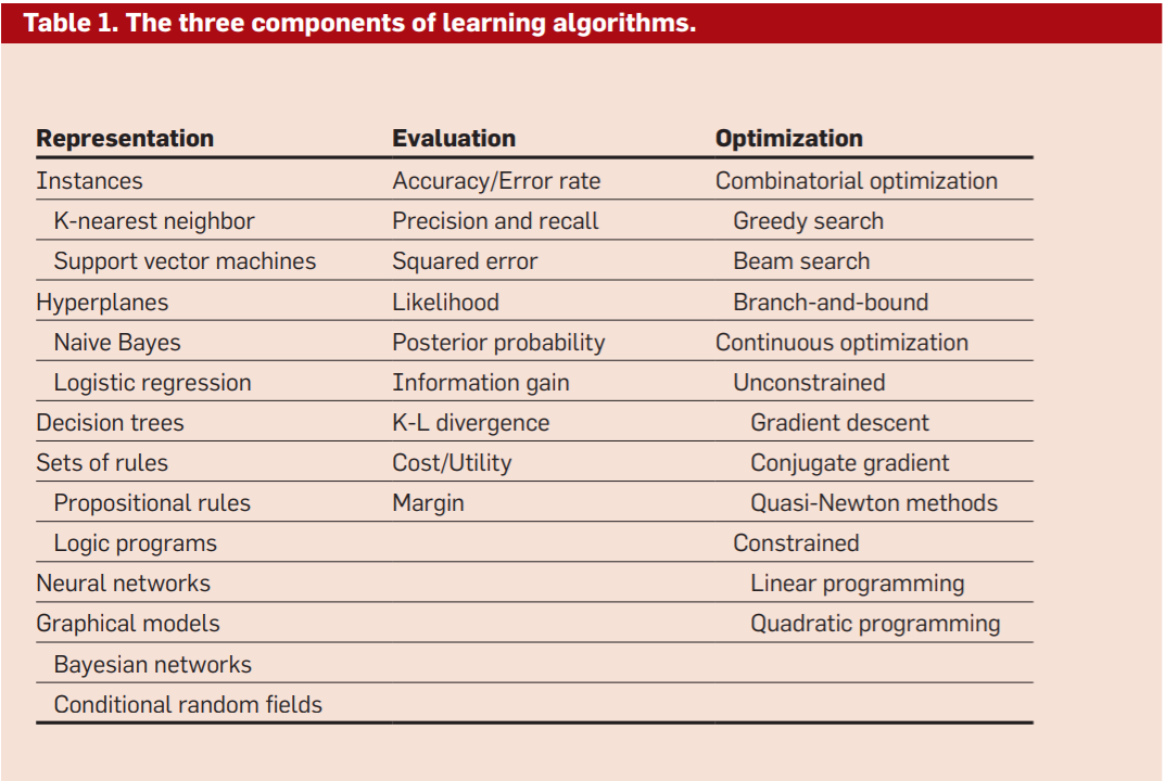 출처: Pedro Domingos. 2012. A few useful things to know about machine learning. Commun. ACM 55, 10 (October 2012), 78–87. DOI:https://doi.org/10.1145/2347736.2347755