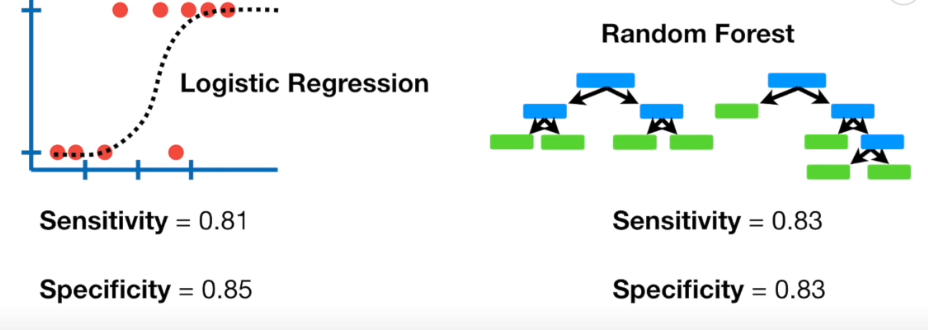 예를 들어 로지스틱 회귀분석을 해서 민감도와 특이도가 각각 0.81과 0.85가 나왔다고 하자. 그렇다면 무슨 기준으로 알고리즘을 선택해야 할까? 이에 따르면 랜덤 포레스트가 심장 질환이 있는 사람을 분류하는데 좀 더 우세를 보이고 로지스틱 회귀분석이 심장 질환이 없는 사람을 분류하는데 좀 더 우세를 보인다. 만약 우리에게 심장 질환이 있는 (양성 개체) 사람을 찾아내는게 더 중요하다면 랜덤 포레스트를 사용할 것이고, 그 반대라면 (음성 개체) 로지스틱 회귀분석을 사용할 것이다.